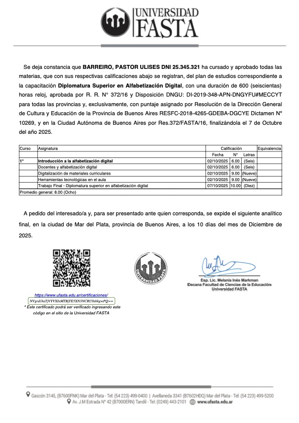 En este marco, nuestro CEO, Ulises Barreiro, ha profundizado su capacitación profesional en áreas directamente vinculadas con las actividades educativas y tecnológicas que impulsa la empresa. Durante el año 2024–2025 completó dos Diplomaturas Superiores en la Universidad FASTA, actualmente en proceso de certificación: